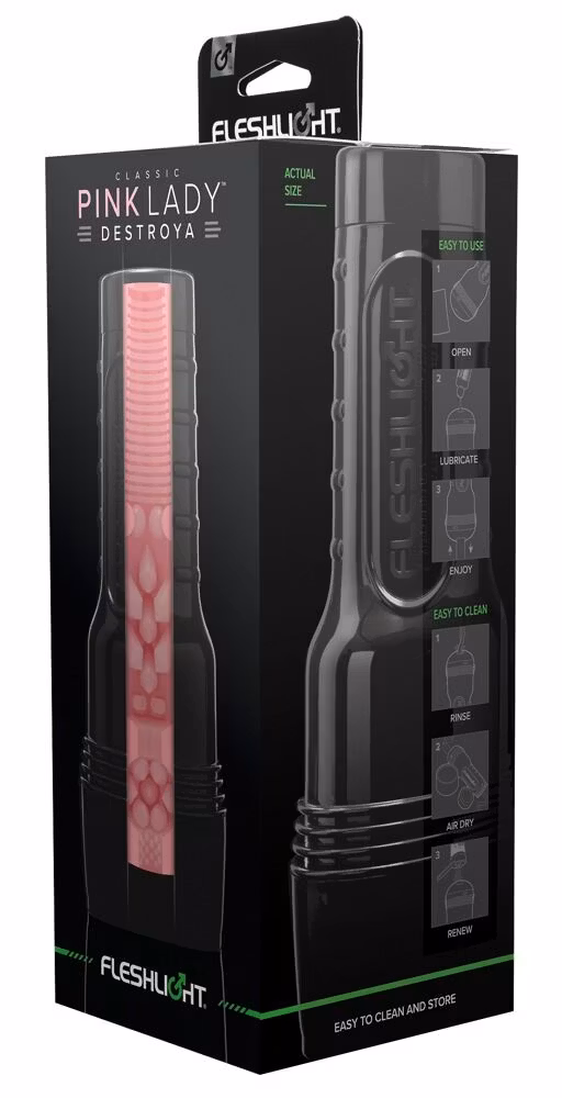 Pink Lady Destroya er laget av det patenterte SuperSkin-materialet, som gir en utrolig realistisk følelse. For å gjøre opplevelsen enda mer intens, kan du justere vakuumet ved hjelp av lokket i bunnen, slik at du får akkurat den trangheten du ønsker. Dette gjør Destroya perfekt både for erfarne brukere og for de som prøver Fleshlight for første gang. Kombiner den med et vannbasert glidemiddel for den ultimate opplevelsen, bruk gjerne FleshLube vannbasert glidemiddel. For å pirre sansene enda litt til, prøv et glidemiddel med varme FleshLube Fire eller et med kjølende effekter, FleshLube Ice.