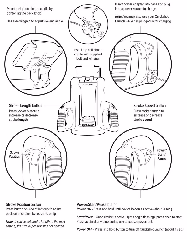Smartphone-Holder for Ekstra Stimulering:For en enda mer oppslukende opplevelse inkluderer Quickshot Launch en universell smartphone-holder. Denne lar deg enkelt se dine favorittvideoer eller -filmer mens du nyter en fullstendig automatisert opplevelse. Perfekt for å kombinere visuell stimulering med fysisk nytelse.