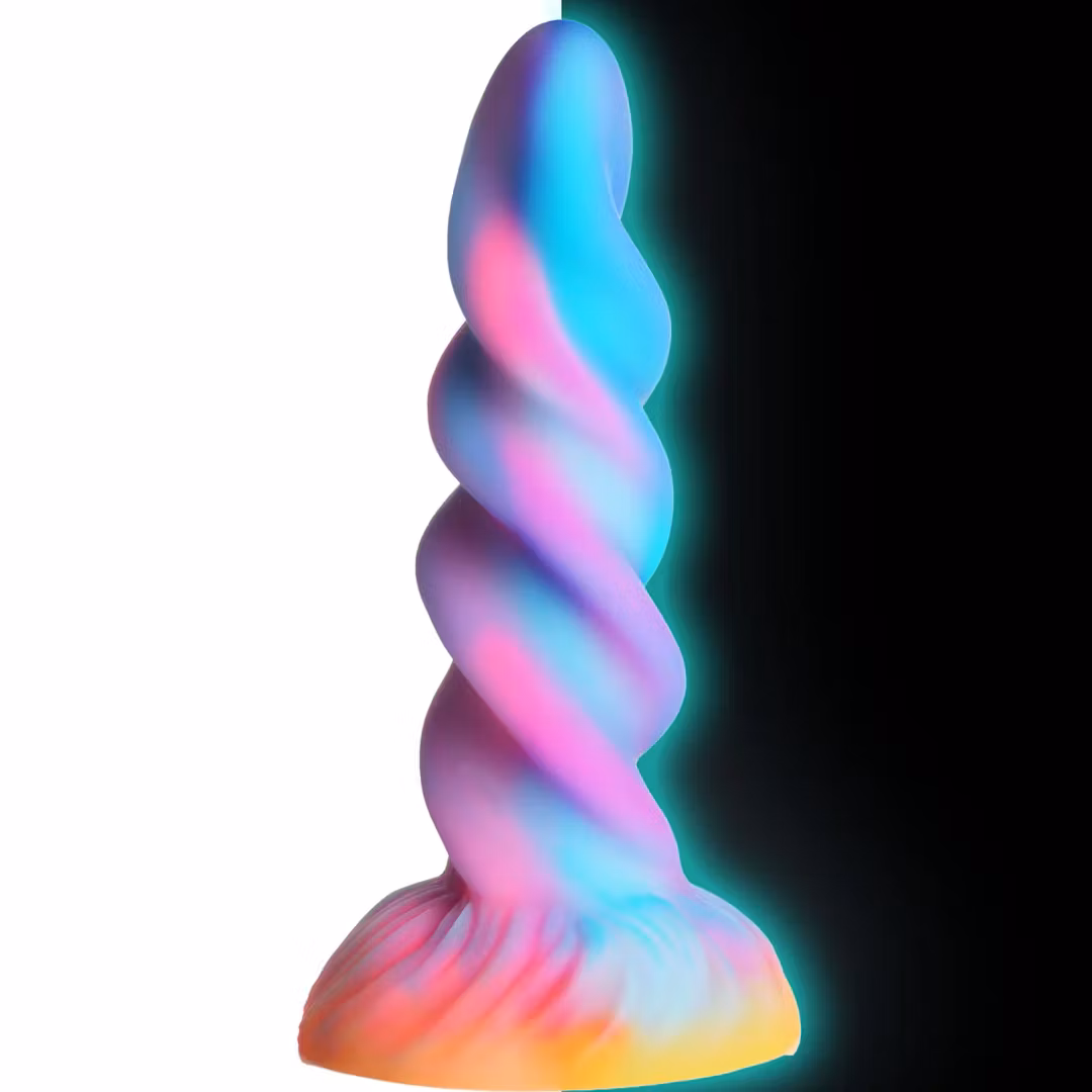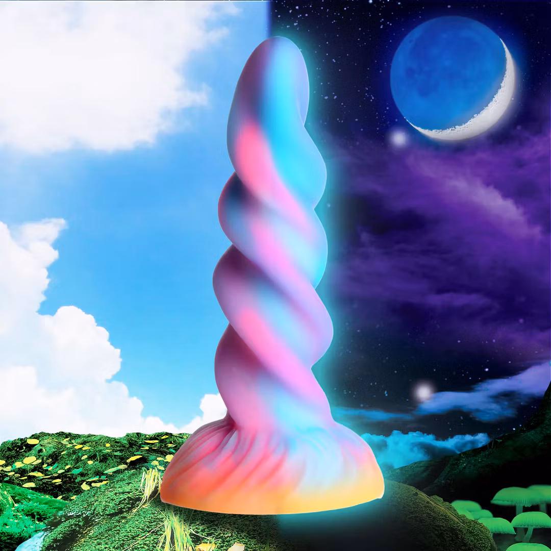 På dagtid fanger den øyet med sine klare, glade farger. Men når mørket senker seg, begynner forvandlingen – og dildoen lyser grønt i natten. Den glatte, spiralformede overflaten og det spisse tuppen gir en deilig, stimulerende reise inn i det ukjente. En sterk sugekoppbase lar deg ri uten hender, og med en harness blir den det ultimate strap-on-verktøyet i rollespill, cosplay eller kinky eventyr.