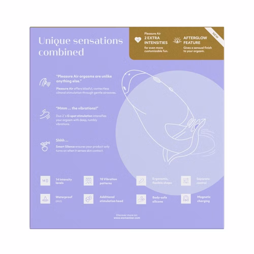 Oppdag sofistikert nytelse med Womanizer DUO 2 i lilla – et perfekt samspill av eleganse og funksjonalitet. Kjøp nå og opplev grenseløs glede!