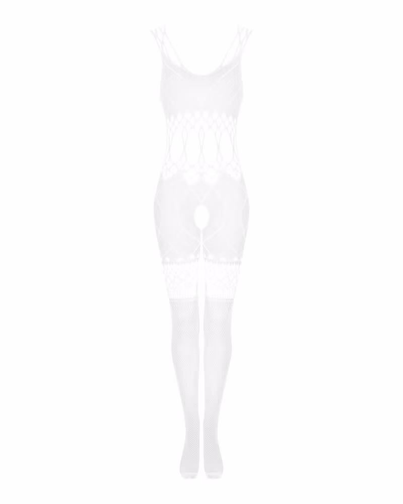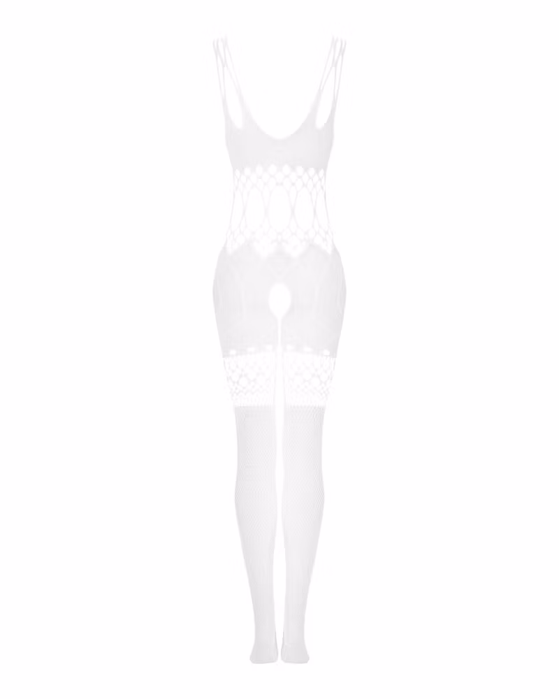 Den "Fristende Hvit Bodystocking" har strategisk plasserte utskjæringer som tilfører et hint av lekenhet til den delikate hvite stilen. Det elegante dekolletéet fremhever brystene på en subtil, men dristig måte, mens den åpne ryggen og sensuelle utskjæringer på hoftepartiet gir en pirrende effekt. Nettingen skaper en visuell illusjon som forlenger kroppen og fremhever dine naturlige kurver. Denne sexy bodystockingen for damer er ideell for både romantiske kvelder og frekk styling under klær.